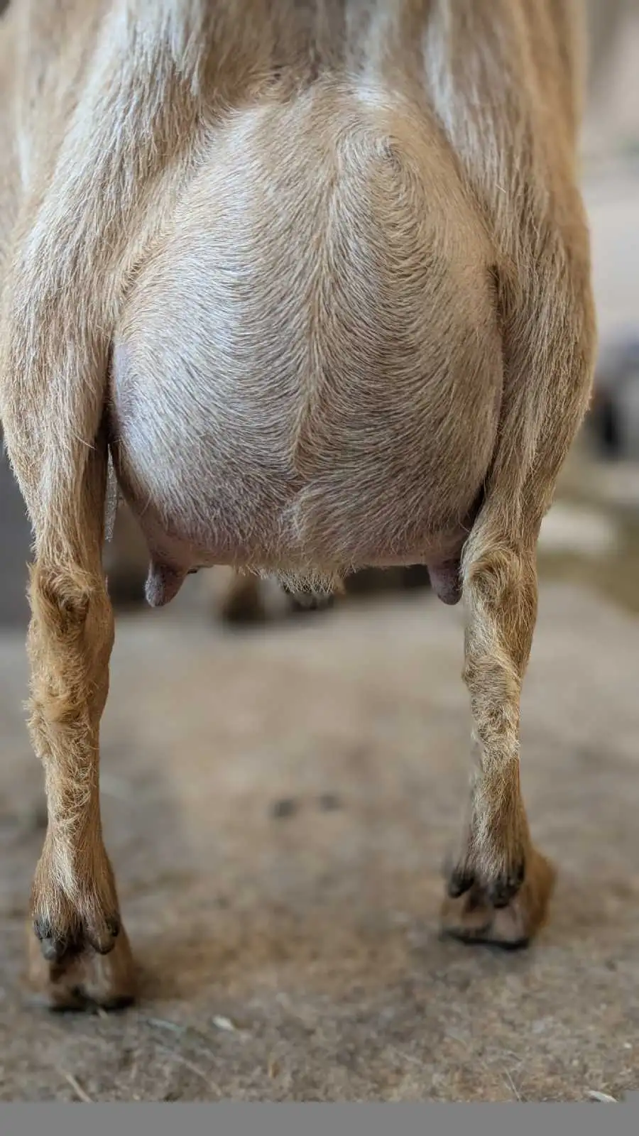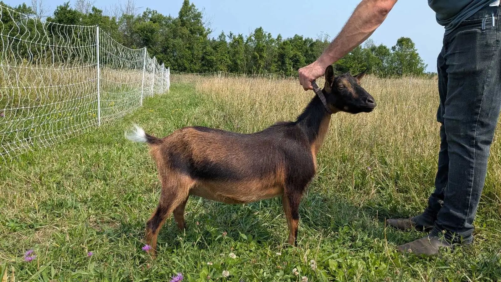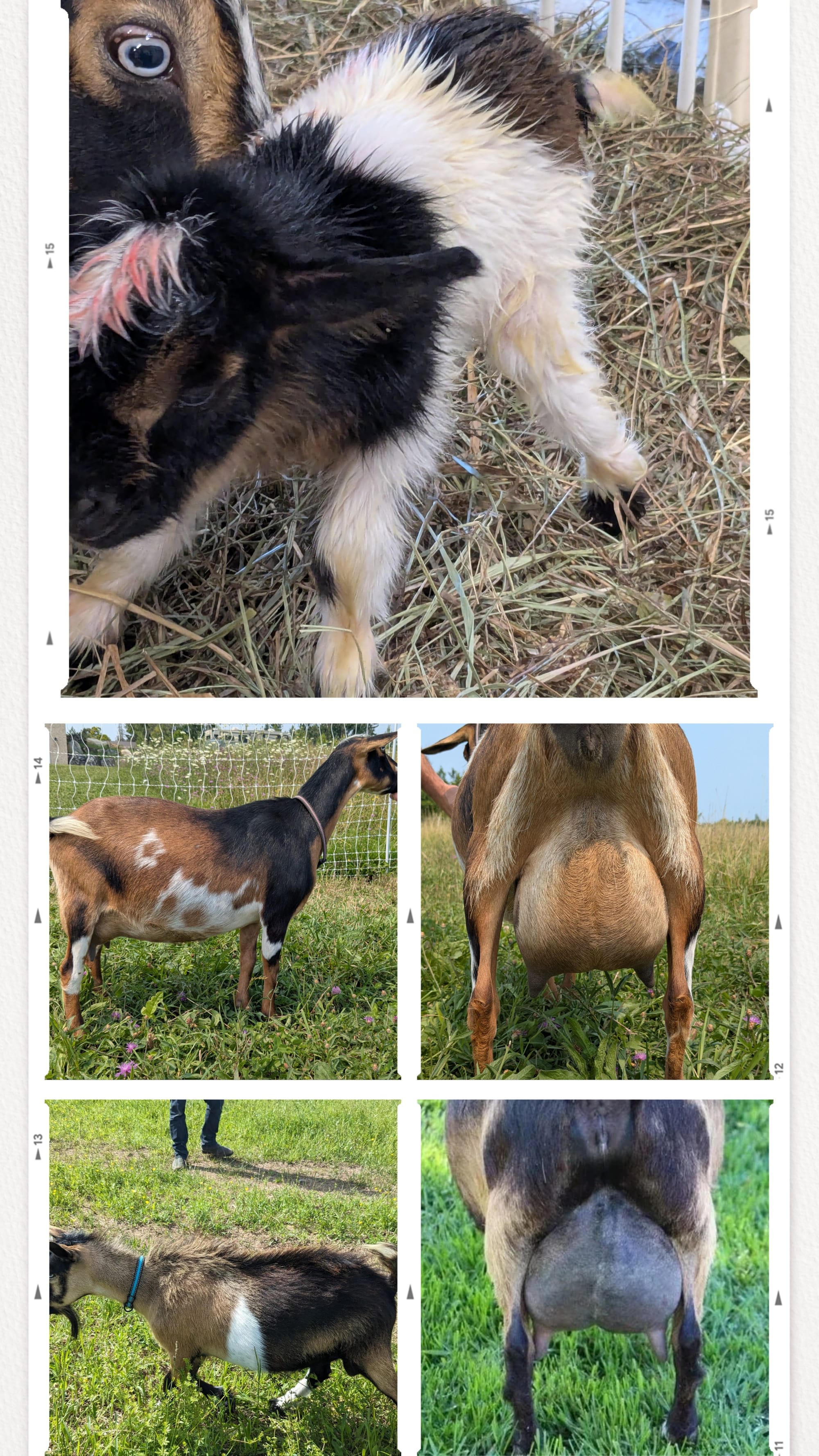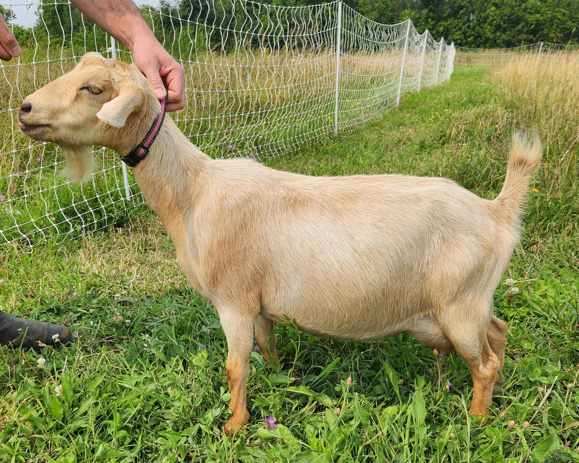 Meadow gave us twin bucklings her first freshening in 2024 and triplet does last year. She gave about 1 liter per milking (12 hour hold) at her peak this year. I am keeping a daughter from her and need to keep my numbers down. She's super friendly, smart and very food motivated. Trained for hand milking and machine. Also very good with small children.