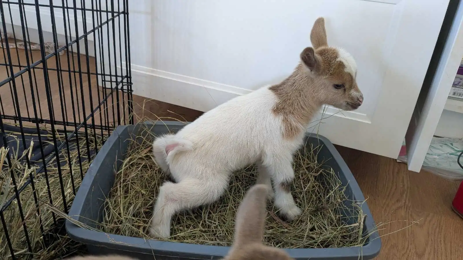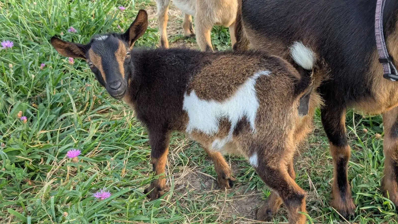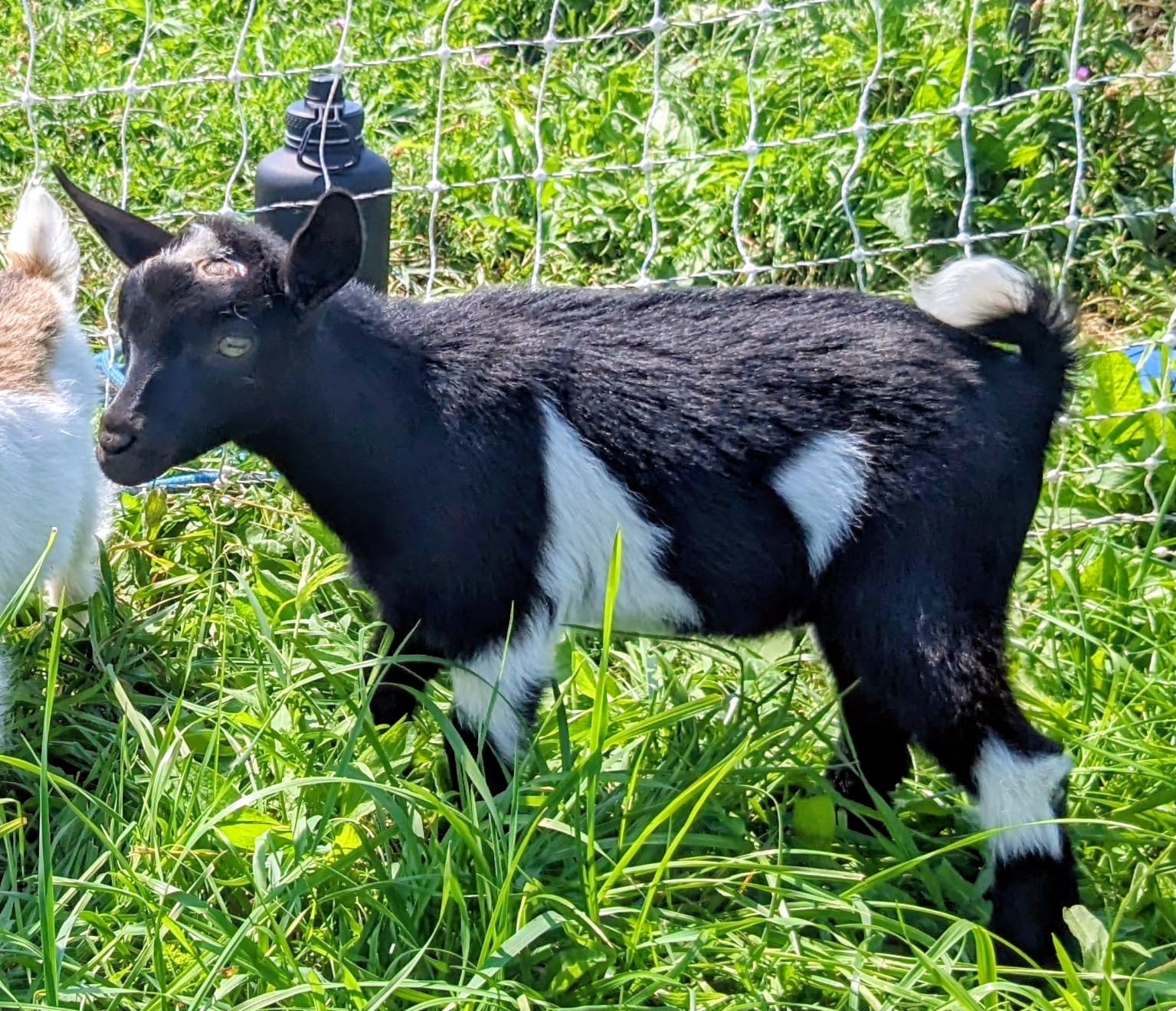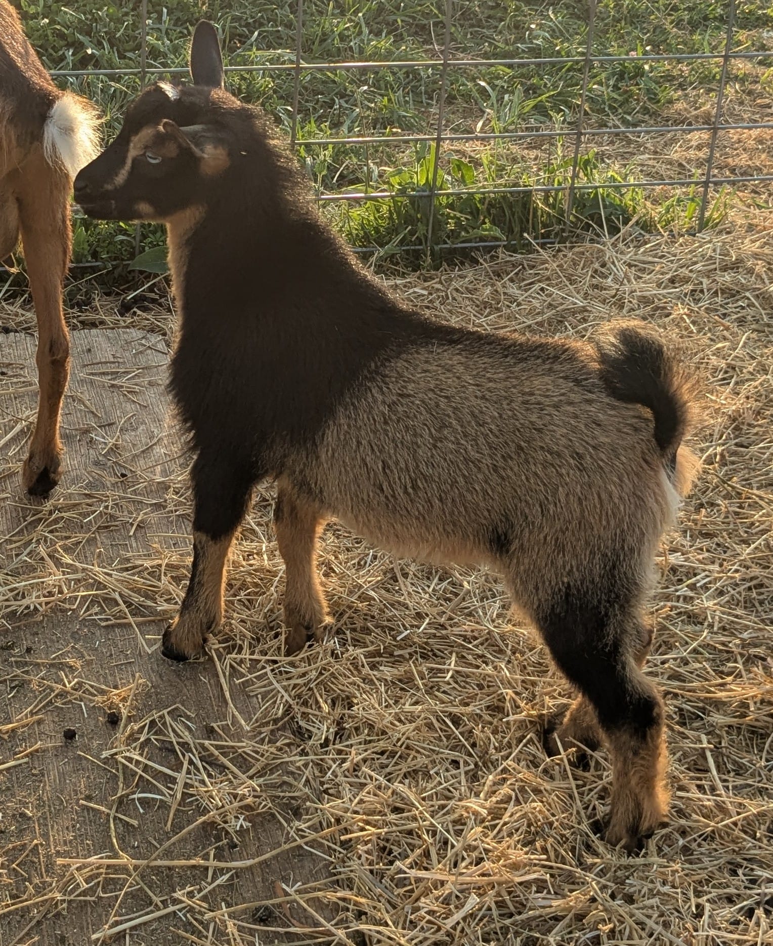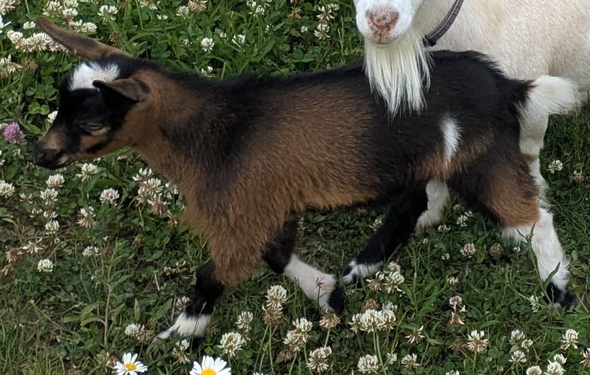 Dot is out of Giffens Glade SC Meadow VG 86 x Lost Coulee MS Jet Stream G+82. Born spring 2025. She was raised both on the bottle and on dam. They were separated at night and I gave them a bottle in the morning after milking out their mom. She is disbudded and very friendly. She was trained to use a litter box inside the house. Raised around small children and chickens.